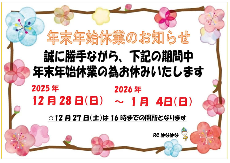 おしらせ新着情報 インシデントのページを更新しました 2026.01.13 2025年10月~12月分を掲載しました。 こちらからご覧いただけます。 Category:お知らせ Author:hanahana はなはな便り2025年12月号を掲載しました 2025.12.22 PDFで見る ●主な内容 ・新入職員紹介 ・活動報告 ・ガイドラインアンケートについて ・進学・就労に関する保護者の集い ・ペアレントプログラム Category:はなはな便り Author:hanahana 年末年始休業のお知らせ 2025.12.16 Category:お知らせ Author:hanahana < 前へ 123456789 次へ >